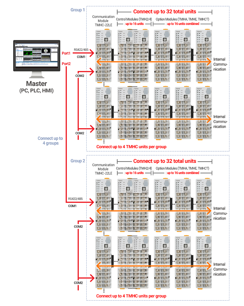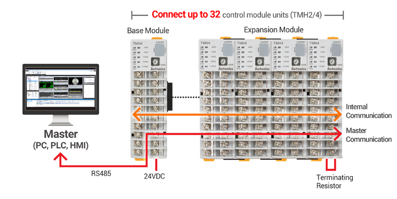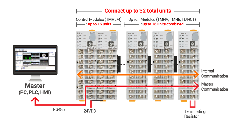 Các mô-đun điều khiển (TMH2 / 4) có thể điều khiển tối đa 2 hoặc 4 kênh đầu vào và đầu ra, hoạt động như 4 bộ điều khiển nhiệt độ riêng biệt.