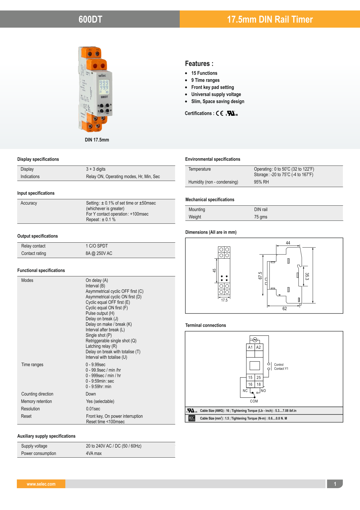 - Các chức năng: On delay, Interval, Asymmetrical cyclic OFF first, Asymmetrical cyclic ON first, Repeat cyclic equal OFF first, Repeat cyclic equal ON first, Pulse output, Delay on break, Delay on make/Delay on break, Interval after break, Single shot, Retriggerable Single shot, Latching relay, Delay on make with Totalise, Interval with Totalise